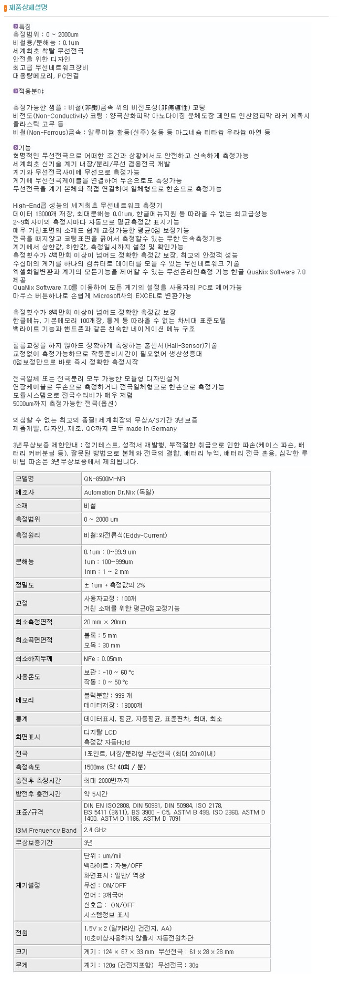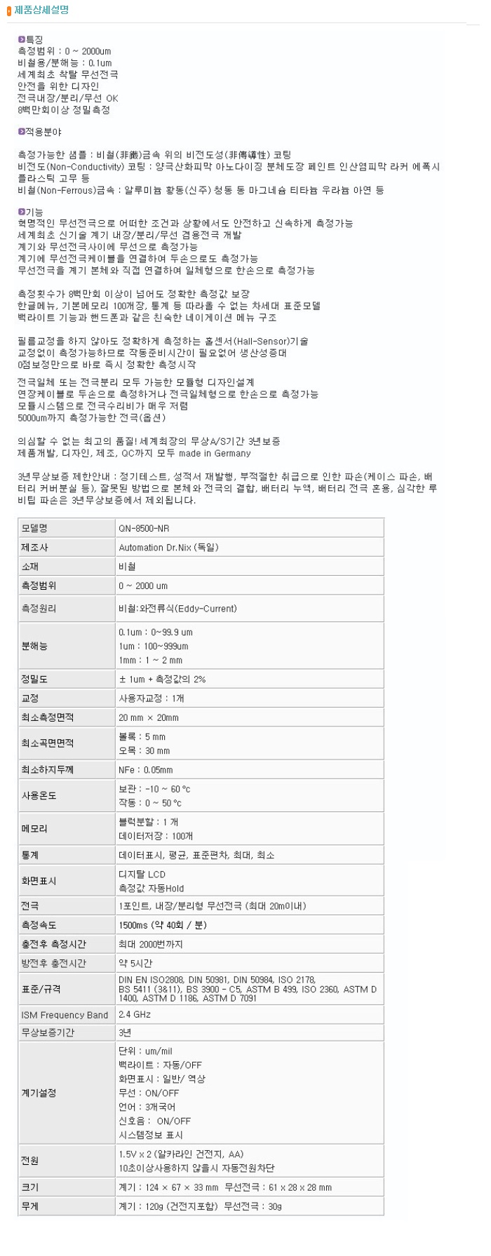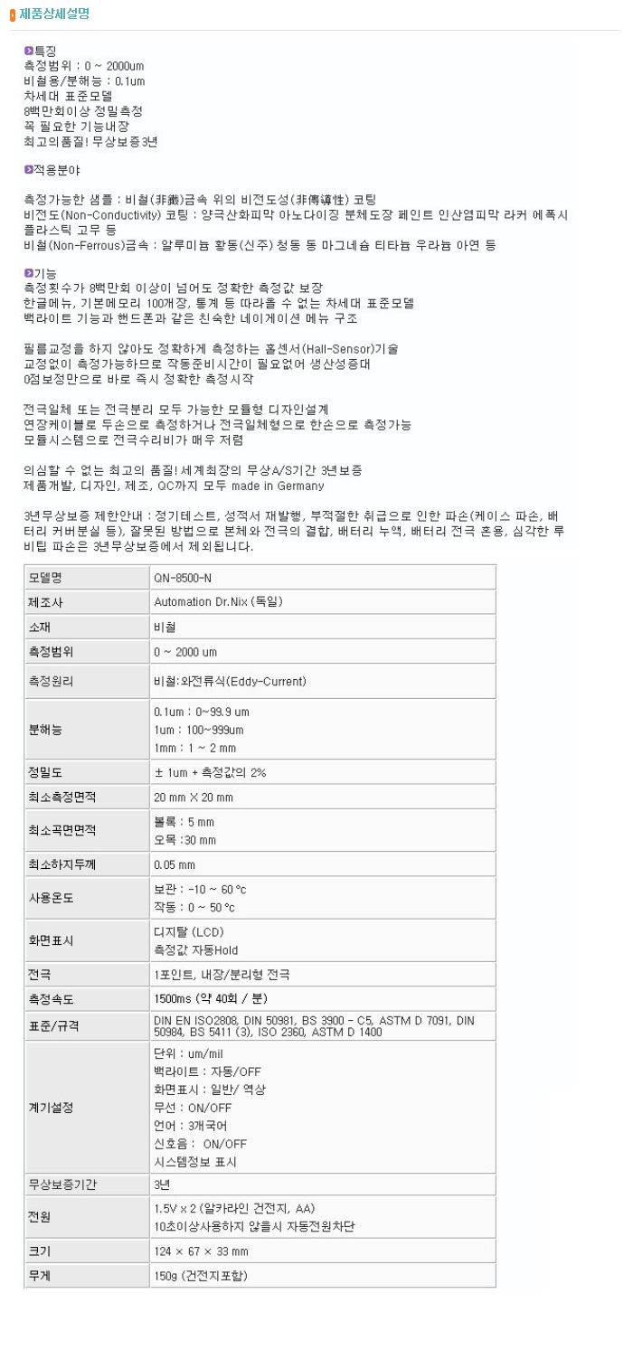 LOGIN JOIN 회사소개 인사말 연혁 조직구성 인정현황 수상이력 공평성보장선언문 오시는 길 교정 교정절차 및 지원서비스 교정이란? 측정의 소급성 교정수수료 및 교정주기 인정항목 교정가능 품목조회 온라인서비스 견적요청 실시간 진행상황 조회 상품판매 길이/측정공구 저울/수분측정기 전기/전자계측기 푸쉬풀/토크게이지 압력계 정밀측정장비 기준게이지 재료시험기 마이크로피펫/디스펜서 환경측정기 고객지원 공지사항 Q&A 자료실 교정 성적서 진위여부 확인 채용정보 FAQ 한국인정기구(KOLAS)인정 KS Q ISO/IEC 17025 국제공인교정기관 길이/측정공구 저울/수분측정기 전기/전자계측기 푸쉬풀/토크게이지 압력계 정밀측정장비 기준게이지 재료시험기 마이크로피펫/디스펜서 환경측정기 재료시험기 도막 두께 측정기 도금 두께측정기 초음파두께측정기 탐상기 경도계 굴절/농도/염분계 수분계 목재수분계 표면거칠기 시험기 점도계 제품명 도막두께측정기(비철용) 모델 QN-8500-NR 제조사 AUTOMATION 규격 제품상세설명 제품명 도막두께측정기(비철용) 모델 QN-8500-N 제조사 AUTOMATION 규격 제품상세설명 제품명 도막두께측정기(비철용) 모델 QN-8500M-NR 제조사 AUTOMATION 규격 제품상세설명 12345678910 계측기 판매